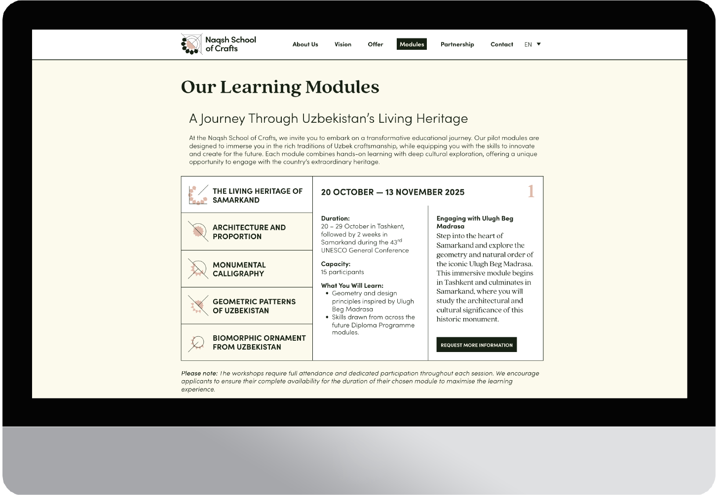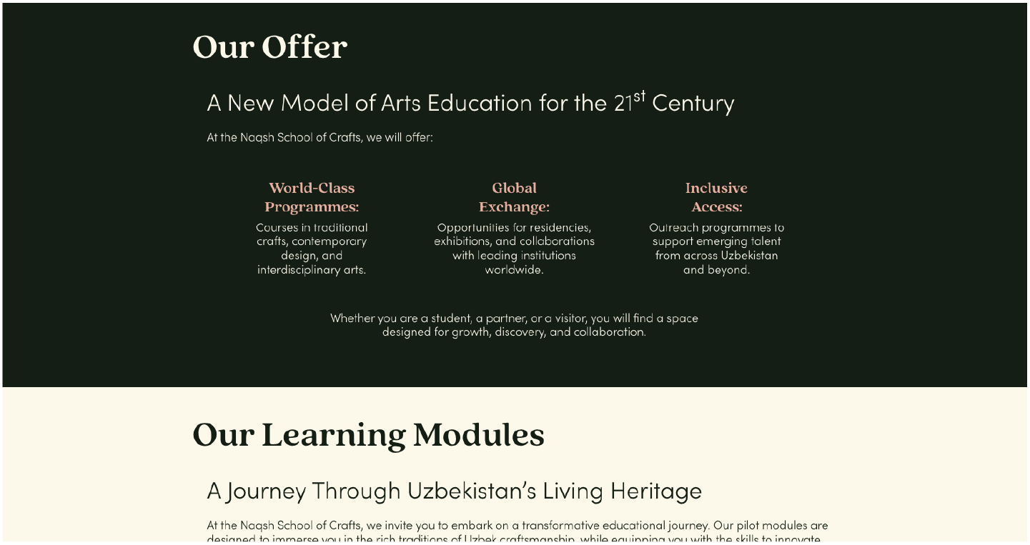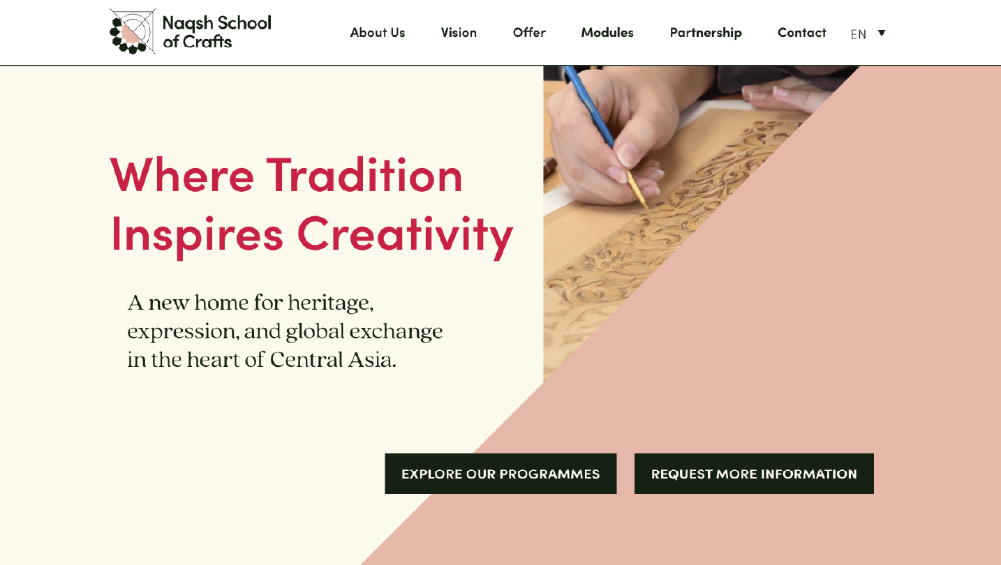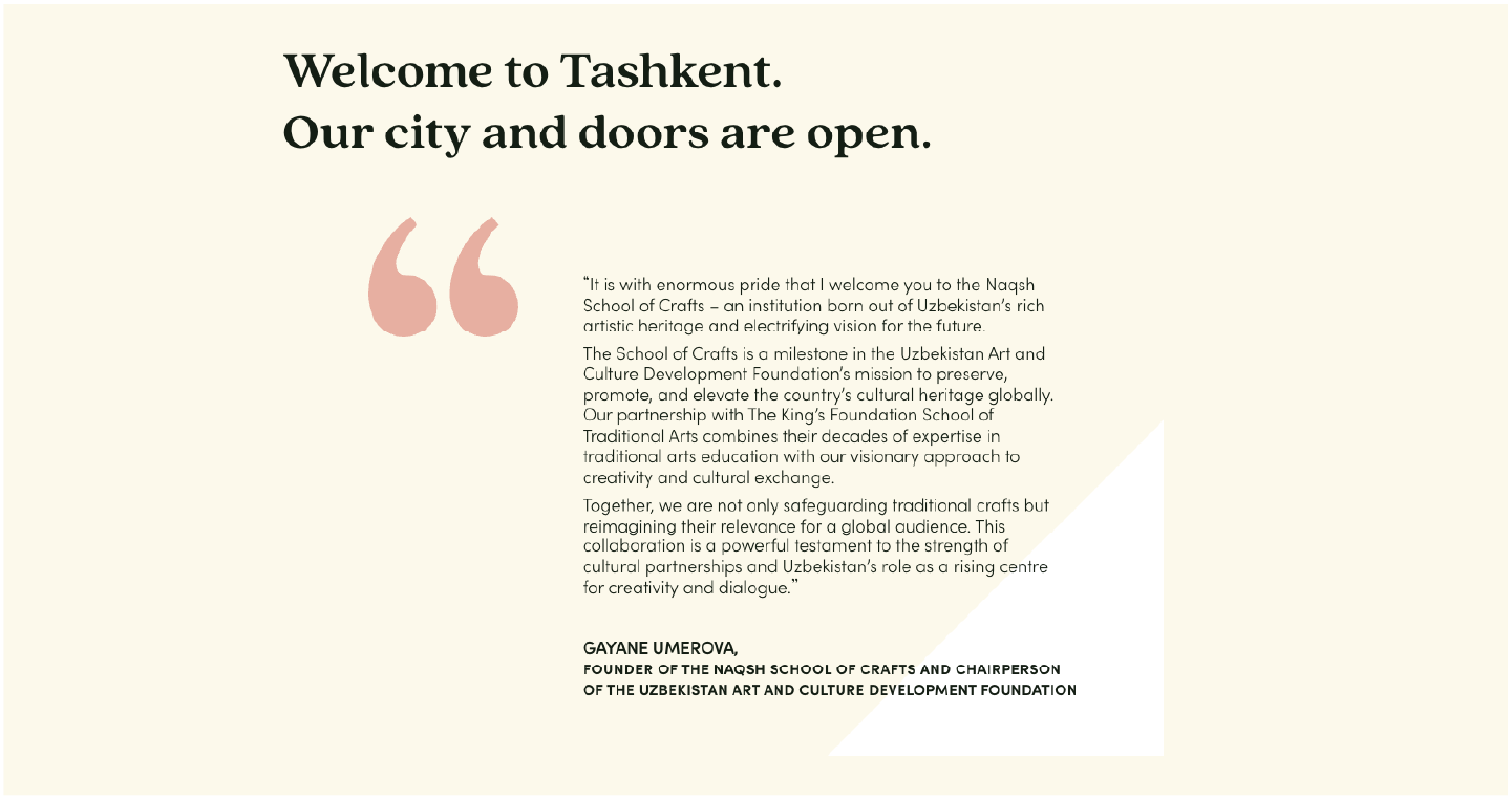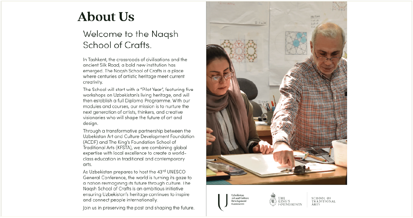 Launched during the UNESCO conference in 2025 in Uzbekistan, the Naqsh School of Crafts is the result of a transformative partnership between the Uzbekistan Art and Culture Development Foundation (ACDF) and The King’s Foundation School of Traditional Arts in London.